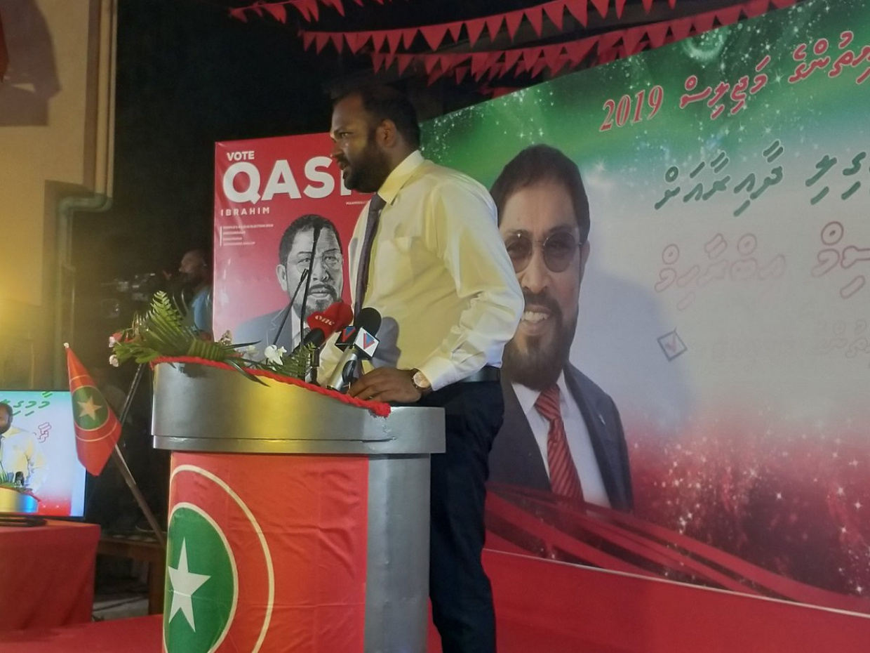 ގާސިމް ކެމްޕެއިން ލޯންޗްކުުރުމަށް ޖުމްހޫރީ ޕާޓީން ރޭ މާމިގިލީގައި ބޭއްވި ޖަލްސާގެ ތެރެއިން: އަލީ ވަހީދު ވަނީ ގާސިމް އާއި ކާނަލް ނާޒިމް، ރިޔާޒު އަދި ޖަމީލަށް ތައުރީފްކޮށް ވާހަކަ ދައްކަވާފައި -- ޓްވީޓާ ފޮޓޯ/ ޖުމްހޫރީ ޕާޓީ