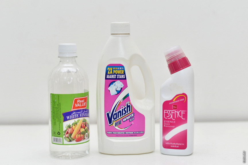 މި ފޮޓޯގައި މި ފެންނަނީ ވައިޓް ވިނެގާ އާއި، ވެނިޝް ސްޓެއިން ރިމޫވާ އަދި އެސެންސް ސްޓެއިން ރިމޫވާ އެވެ. މި ތަކެއްޗަކީ ހެދުންތައް ނުވަތަަ ބެޑްޝީޓްގައި ޖެހޭ ނަމަވެސް ފިލުވަން އުދަނގޫ ލައްތައް ފިލުވުމަށް ބޭނުންކުރާ ތަކެއްޗެވެ. ހާއްސަކޮށް ފިރިމީހާގެ ހުދު ގަމީސްތަކާއި ބެޑްޝީޓްތަކުގެ މިފަދަ ސްޓެއިން އެއް ޖެހިއްޖެނަމަ އެސެންސް ނުވަތަ ވެނިޝް ސްޓެއިން ރިމޫވާ އެތަނެއްގައި ހޭކުމަށްފަހު މެޝިނުން ދޮވެލަނީ އެވެ.