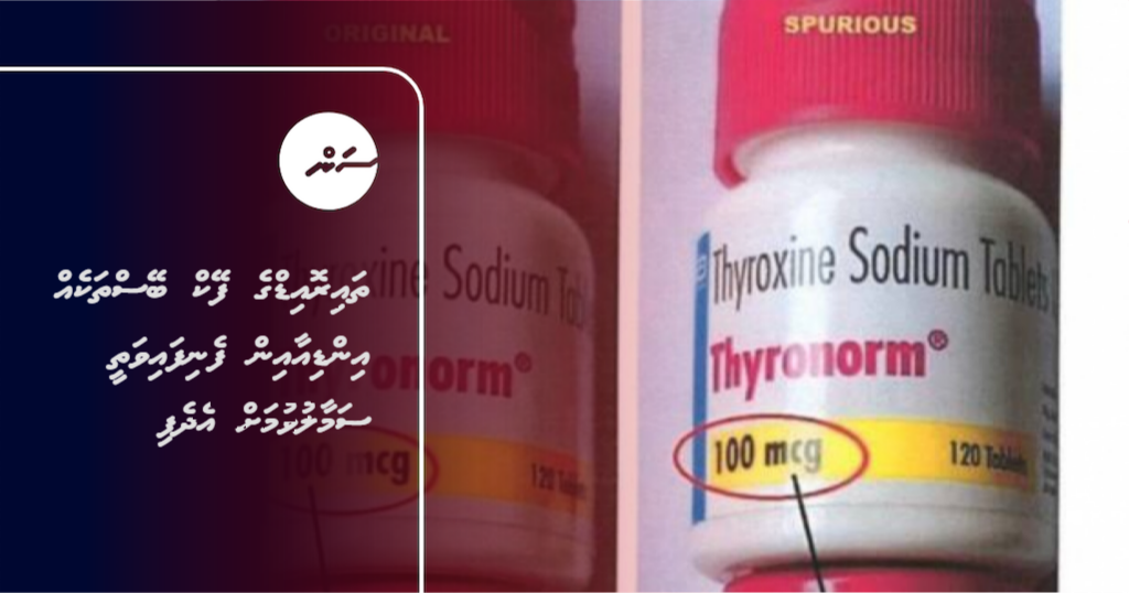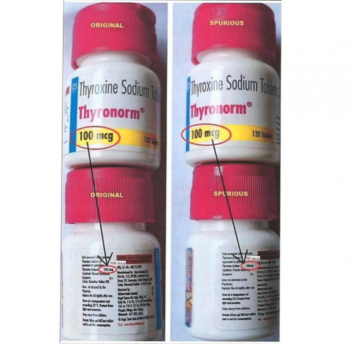 އެކަމާ ގުޅިގެން އެ އޮތޯރިޓީން ނެރުނު ބަޔާނެއްގައި ވަނީ އިންޑިއާގެ އެމްކޭ ޖެނެރިކްސް އެލްއެލްޓީ ކުންފުނިން އުފައްދާ Thyronorm 100 mcg ބޭހުގެ ކައުންޓާފީޓް ޕްރޮޑަކްޓެއް ނުވަތަ ފޭކް ބޭހެއް ފެނިފައިވާކަމަށް އެ ގައުމުގެ ތެލަންގަނާ ޑްރަގްސް ކޮންޓްރޯލް އެޑްމިނިސްޓްރޭޝަނުން އަންގާފައިވާކަމަށެވެ.