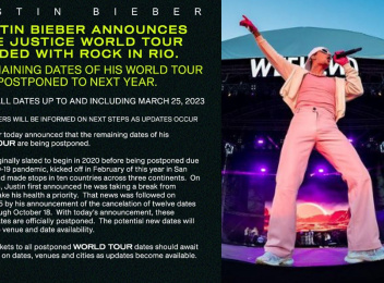 ނަމަވެސް ޞިއްޙަތަށް އިސްކަން ދިނުމަށް ކަމަށްބުނެ ޖަސްޓިން ބީބާ ގެ ޝޯތައް ފަސްކޮށްލާ ވާހަކަ ސެޕްޓެމްބަރު ހައެއް ގައި އޭނާ ވަނީ އިޢުލާންކޮށްފައެވެ. އަދި އެއަށްފަހު ސެޕްޓެމްބަރު 15 ގައި އިޢުލާންކުރީ އޮކްޓޯބަރު 18 އާ ހަމައަށް ހުރި ހުރިހާ ޝޯއެއްވެސް ކެންސަލްކުރި ވާހަކައެވެ. އަދި މިފަހަރު މި އެންގީ ދެން މިއަހަރު ކުރިއަށްހުރި ހުރިހާ ޝޯއެއް ވަކި ތާރީޚެއް ނެތި ފަސްކުރި ވާހަކައެވެ.