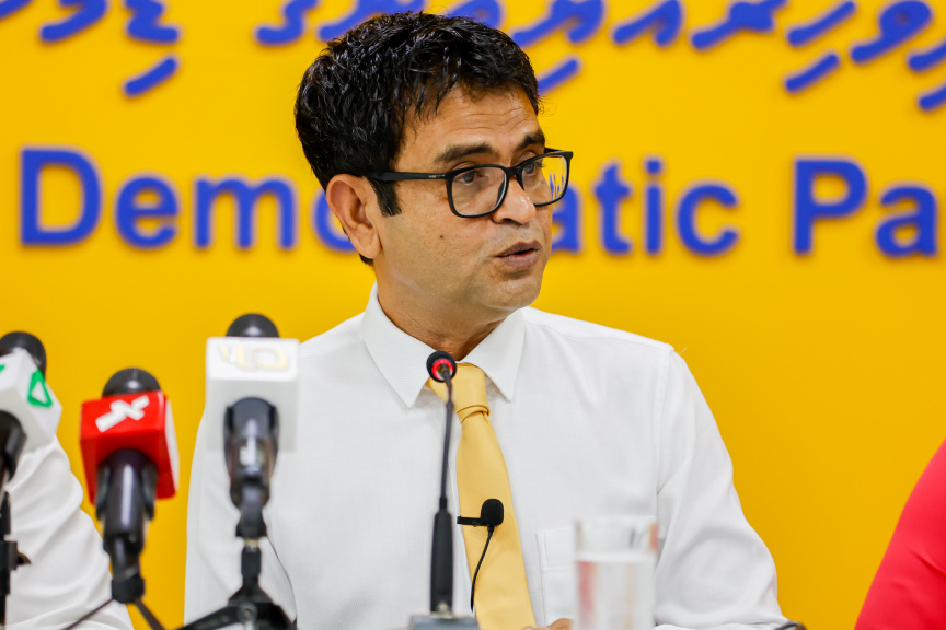 މިއަދު އެމްޑީޕީން ބޭއްވި ނޫސްވެރިންގެ ބައްދަލުވުމުގައި ޕާޓީގެ ހޯރަފުށީ ދާއިރާގެ ކުރީގެ މެންބަރު އަހުމަދު ސަލީމް ވާހަކަދައްކަވަނީ -- ފޮޓޯ/ އެމްޑީޕީ