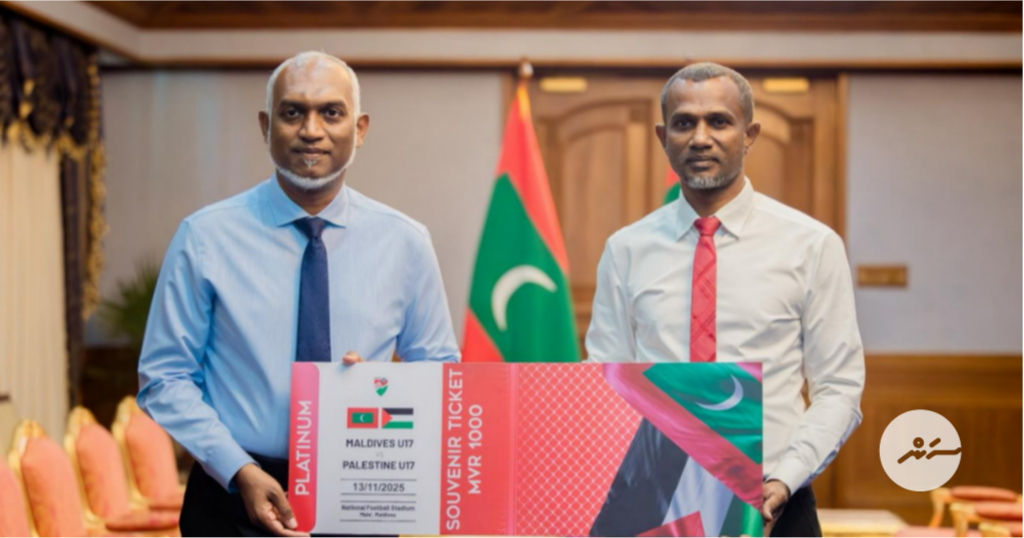 ދިވެހިރާއްޖޭގެ 17 އަހަރުން ދަށުގެ ގައުމީ ފުޓުބޯޅަ ޓީމާއި ފަލަސްތީނުގެ 17 އަހަރުން ދަށުގެ ގައުމީ ޓީމު ކުޅޭ އެކުވެރިކަމުގެ ފުރަތަމަ މެޗުގެ ސުވެނިއާ ޕްލެޓިނަމް ޓިކެޓު ރައީސުލްޖުމްހޫރިއްޔާ ޑރ. މުޙައްމަދު މުޢިއްޒު ބައްލަވައިގެންފިއެވެ.