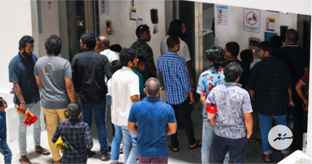 ހިޔާ ޓަވަރުތަކުގައި ލިފްޓް ބާރު ބޮޑުވެ ލިފްޓް ކައިރީގައި ދިގު ކިޔޫއެއް ހަދާފައި -- ސަން ފޮޓޯ/ މުހައްމަދު ހައްޔާން