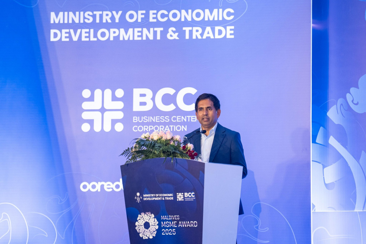 މިނިސްޓަރު ސައީދު، އެސްއެސްއެމްއީ އެވޯޑު ދެއްވުން: ވިދާޅުވީ، މޫޑީސްއިން ގެނައި ބަދަލަކީ ވިޔަފާރިތަކަށް ލިބުނު ހިތްހަމަޖެހުމެއް ކަމަށް ---- ފޮޓޯ/ އިކޮނޮމިކް މިނިސްޓްރީ