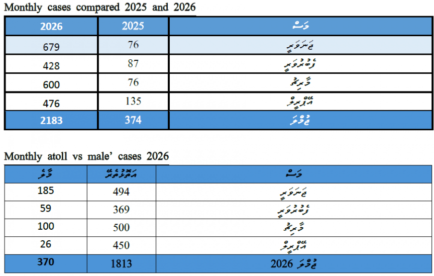 މަސްތަކަށް ބަލާއިރު، މިދިޔަ އަހަރުގެ ޖެނުއަރީ މަހު ރިޕޯޓްކުރީ އެންމެ 75 ކޭސް ނަމަވެސް، މިއަހަރުގެ ޖެނުއަރީގައި 679 ކޭސް ރިޕޯޓްކޮށްފައިވެއެވެ. މި އަހަރުގެ ފެބްރުއަރީ މަހު 428 ކޭސް ރިޕޯޓްކޮށްފައިވާއިރު، މާޗް މަހު 600 ކޭސް އަދި އޭޕްރީލް މަހުގެ މިހާތަނަށް 476 ކޭސް ވަނީ ރިޕޯޓްކޮށްފައެވެ.